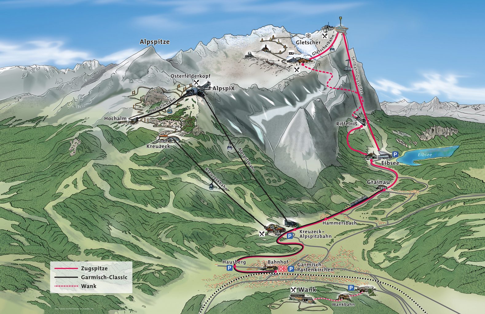 The best thing is to buy the Deutsch Bahn Zugspitze Summer or Winter Combo ticket. This ticket includes trains from Munich to the top of the peak including cogwheel trains and cable cars.